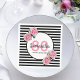 A napkin for a 80th birthday party. Classic slim black and white horizontal stripes as background. With girly and feminine pink roses as decoration.