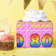 This upbeat and cheerful 80th birthday-themed wrapping paper design features a large number "80" having a colourful pattern inspired by the look of a rainbow spectrum. It also features the message "Happy 80th Birthday,", and a custom name. The background features a cheerful pattern of dark pink and light pink stripes containing loving pink heart shapes. Birthday themed wrapping paper like this might be used when giving a gift or present in celebration of somebody’s eightieth birthday. [~Z0000415]
