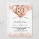 For an elegant 80th birthday. A white background. Decorated with rose gold confetti and balloons. Personalize and add a name, and party details. The name is written with a hand lettered style script, number 80 with balloon style fonts.