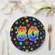 This colourful, cheerful, and fun paper plate design features a large number "80" coloured with a rainbow spectrum gradient inspired pattern. The background features a pattern of colourful star shapes. Fun paper plates like this might be used at a celebration being held to observe somebody’s eightieth birthday, or a couple’s eightieth anniversary, or some other 80th event. [~Z0000493]