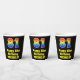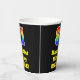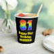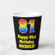 This fun and exciting birthday paper cup design features a large number “81” with a rainbow spectrum gradient inspired pattern, along with the message “Happy 81st Birthday,”, and a personalized name. The background is coloured black. Vibrant, colourful paper cups like this might be fun to use at a birthday celebration/party being held to celebrate somebody’s 81st birthday. [~Z0000537]