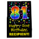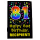 This colourful, fun, and vibrant birthday-themed giftbag design features a large number "81" with a rainbow spectrum gradient style pattern, along with the message "Happy 81st Birthday,", and an editable recipient name. It also has a colourful background pattern featuring star shapes of various sizes. A gift bag like this might be used when wrapping gifts being given to somebody in celebration of their 81st birthday. [~Z0000510]