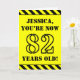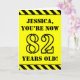 The front of this attention-grabbing and bold birthday-themed greeting card design features a personalized name and the message "YOU’RE NOW 82 YEARS OLD!" in black stencil inspired text on a yellow colored background. The front also features an eye-catching black and yellow striped pattern at the top and bottom edges. The inside features a custom birthday greeting message, or could perhaps be cleared and left blank if a message is to be written by hand instead. A personalized birthday card like this might be a fun way to send a message in celebration of somebody’s eighty second birthday. [~Z0000413]