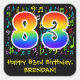This fun, vibrant, and colourful birthday sticker design features a large number "83" with a rainbow spectrum gradient inspired pattern, along with the message "Happy 83rd Birthday,", and a custom name. Part of the background has a colourful music notes and symbols pattern. Birthday-themed stickers like this might be fun to use as a birthday celebration decoration, or perhaps give as a birthday gift, or perhaps be used when wrapping birthday presents being given in celebration of a song composer’s, a musician’s, a singer’s, or somebody else’s eighty third birthday. [~Z0000423]