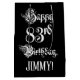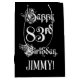 This opulent and fancy birthday-themed gift bag design features the message “Happy 83rd Birthday,” in ornate script style text, on a black coloured background. It also has a custom recipient name. A giftbag like this might be a respectable way of wrapping a birthday present or gift being given to somebody who is celebrating their 83rd birthday. [~Z0000557]