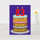 This fun and upbeat birthday themed greeting card design features a depiction of a three-tier birthday cake having number-shaped candles on top showing the age “83“, along with the message “HAPPY 83RD BIRTHDAY,”, and an editable recipient name. The inside has a customizable birthday greeting message, or could perhaps be cleared and left blank if a message is to be written by hand instead. A joyful, personalized birthday greeting card like this might be a fun way to deliver a birthday greeting message to somebody who is celebrating their eighty-third birthday. [~Z0000620]