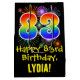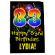 This exciting, fun, and colourful birthday gift bag design features a large number "83" with a rainbow spectrum gradient inspired pattern, along with the message "Happy 83rd Birthday,", and an editable recipient name. It also features a colourful background pattern inspired by the appearance of bursting celebratory fireworks. A gift-bag like this might be used when giving a gift or present in honour of somebody’s 83rd birthday. [~Z0000509]