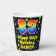 This cheerful and colourful birthday-themed paper cup design features a large number “83” having a rainbow spectrum gradient inspired pattern. It also features the message “Happy 83rd Birthday,”, and a customizable name. The background features a multicolored star field inspired pattern. Colourful, vibrant paper cups like this might be fun to use at a birthday party being held in celebration of somebody’s eighty third birthday. [~Z0000540]