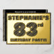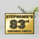 The front of this bold eighty-third birthday celebration foil invitation card features a custom name, a large number “83rd”, the message “BIRTHDAY PARTY!”, and a border, all featuring a rustic, yet elegant, faux wood grain appearance inspired pattern. The back features personalized details about the event, such as the date, time, place/venue, and any other important information. Personalized invitations like these might be used to invite attendees to a birthday gathering/party being held in celebration of somebody’s 83rd birthday. [~Z0000595]