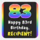 This bold and eye-catching birthday-themed square sticker design features the number “83“ with a vibrant rainbow spectrum inspired gradient pattern, along with the message “Happy 83rd Birthday,”, and a custom recipient name. Upbeat birthday themed stickers like these might be used or given out at a party in celebration of somebody’s 83rd birthday, or perhaps used when preparing presents or invitations for such an event. [~Z0000630]