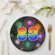 This cheerful, colourful, and fun paper plate design features a large number "83" containing a rainbow spectrum gradient inspired pattern colouring. It also features a vibrant and exciting bursting celebratory fireworks inspired pattern. The background is coloured black. Paper plates like this might be fun to use at a party being held to celebrate somebody’s 83rd birthday, an 83rd anniversary, or some other 83rd event. [~Z0000490]