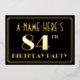 The front of this 1920s/1930s style inspired eighty-fourth birthday celebration/party foil invitation features a custom name, a large art deco look inspired number “84th”, the message “BIRTHDAY PARTY”, and a border pattern consisting of lines. The front also has a black-coloured background by default, but it can be customized to a different colour if desired. The back features personalized details about the event, such as the date, time, venue, and any other information that may be important. Luxurious, elegant, customized invitations like these might be used to invite guests to a birthday party being held in celebration of somebody’s 84th birthday. [~Z0000591]