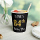 This opulent and ornate birthday-themed paper cup design features an editable name and the message “84th Birthday Party”. The large number “84th” has a faux/imitation gold-inspired colouring pattern, the words “Birthday Party” are in luxurious script-style text, and the background is coloured black by default (although it can be customized). Luxurious, fancy paper cups like this might be useful at a birthday celebration/party being held to honour somebody’s 84th birthday. [~Z0000567]