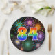 This colourful, cheerful, and fun paper plate design features a large number "84" having a rainbow spectrum gradient inspired pattern colouring. It also features a exciting and vibrant bursting celebratory fireworks inspired pattern. The background is coloured black. Paper plates like this might be fun to use at a party being held to celebrate somebody’s eighty fourth birthday, an 84th anniversary, or some other 84th event. [~Z0000490]