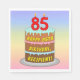 This cheerful and colourful birthday paper napkin design features a cartoon-style depiction of a three-tier birthday cake having number-shaped candles on top showing the age “85“, along with the message “HAPPY 85TH BIRTHDAY,”, and a customizable recipient name. The background features a multi-colour pastel rainbow spectrum inspired gradient pattern. Paper napkins like these might be used at a party held in celebration of somebody’s eighty fifth birthday. [~Z0000623]