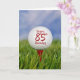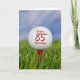 Close up of a white golf ball on a red tee in grass with sky background for 85th birthday.