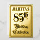The front of this ornate eighty-fifth birthday celebration foil announcement/invitation card design features the message “85th Birthday Celebration” in opulent script-style text. It also has an editable name. The back features personalized details about the event, such as the date, time, venue/place, and any other relevant information. Opulent, elegant, editable invitations like these might be used to invite guests to a birthday celebration/party being held to honour somebody’s 85th birthday. [~Z0000596]