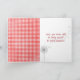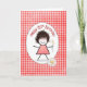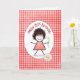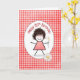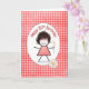 Cute stick girl with hair, red glasses, gingham dress, and holding daisies on a red and white gingham pattern for 85th birthday.