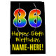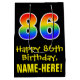 This fun, exciting, and colourful birthday-themed giftbag design features a large number "86" with a rainbow spectrum gradient inspired pattern, along with the message "Happy 86th Birthday,", and an editable recipient name. It also has a black-coloured background. A giftbag like this might be used when giving a gift or present in honour of somebody’s eighty sixth birthday. [~Z0000512]