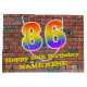 This colourful and fun birthday themed gift bag design, inspired by graffiti, features a large number "86" with a rainbow spectrum gradient inspired pattern, along with the message "Happy 86th Birthday,", and an editable name. It also has a brick wall inspired pattern background. A vibrant gift-bag like this might be a fun way of wrapping a birthday present or gift being given to somebody who is celebrating their eighty sixth birthday. [~Z0000522]