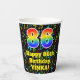 This colourful and fun music-themed birthday paper cup design features a large number “86” with a rainbow spectrum gradient inspired pattern, along with the message “Happy 86th Birthday,”, and a custom name. The background features a multicolored pattern of various music notes and symbols having a variety of sizes and colours. Colourful, vibrant paper cups like this might be fun to have at a birthday party/celebration being held in celebration of somebody’s eighty sixth birthday. [~Z0000541]