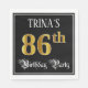 This fancy and elegant birthday themed paper napkin design features an editable name and the message “86th Birthday Party”. The large number “86th” has a faux/imitation gold-inspired colouring pattern, the words “Birthday Party” are in ornate script-style text, and the background is coloured black by default (although it can be customized). Ornate, luxurious paper napkins like this might be used at a birthday celebration being held to honour somebody’s 86th birthday. [~Z0000565]