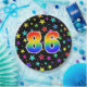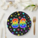 This cheerful, colourful, and fun paper plate design features a large number "86" containing a rainbow spectrum gradient inspired pattern. The background features a pattern of colourful star shapes. Paper plates like this might be used at a party celebrating somebody’s eighty sixth birthday, or a couple’s 86th anniversary, or some other eighty sixth event. [~Z0000493]