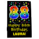 This exciting, vibrant, and fun birthday giftbag design features a large number "88" with a rainbow spectrum gradient style pattern, along with the message "Happy 88th Birthday,", and an editable recipient name. It also has a colourful background pattern featuring star shapes of various sizes. A gift bag like this might be used when wrapping gifts being given to somebody in celebration of their 88th birthday. [~Z0000510]