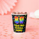 This colourful and joyful birthday-themed paper cup design features a large number “89” with a rainbow spectrum gradient inspired pattern, along with the message “Happy 89th Birthday,”, and a custom name. The background features an exciting and colourful star field inspired pattern. Colourful, vibrant paper cups like this might be fun to use at a birthday party/celebration being held in celebration of somebody’s eighty ninth birthday. [~Z0000540]