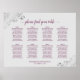 Ce magnifique tableau de sièges mariage présente un design chic et sophistiqué avec du texte en cassis violet ou magenta sur un arrière - plan gris clair. Le titre est une élégante calligraphie de script lisant : s'il vous plaît trouver votre table. Les coins sont décorés de fraises argentées en faux feuillage, dans un motif floral délicat. Comprend 8 tables ou 80 personnes avec 10 places par table. Une belle façon d'aider vos clients à trouver leurs tables à la réception tout en ajoutant une touche de style.