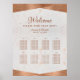 Ce tableau de sièges mariage avec 8 tables combine plusieurs tendances de 2019 : géométrique, marbre, métal (cuivre) et polices spéciales (un élégant script calligraphique). L'arrière - plan est en marbre blanc. Sur les bords haut et bas, il y a du cuivre faux métallique, formant des angles et un hexagone irrégulier de marbre blanc. Les noms de la mariée et du marié et le titre Bienvenue sont écrits dans un élégant script calligraphique. Tout le texte a une couleur rouge-brun, comme le cuivre.