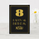 The front of this vintage look and 1920s-1930s style inspired birthday greeting card design features a large art deco style inspired number "8", the message "HAPPY 8th BIRTHDAY,", a personalized name, and a border pattern consisting of lines. There is a black-coloured background on the front. The inside features an editable birthday greeting message, or could perhaps be cleared and left blank if a message is to be written by hand instead. A personalized birthday card like this might be a fun way to send birthday wishes to somebody who is celebrating their eighth birthday. [~Z0000502]