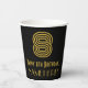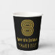 This 1920s/1930s style inspired and vintage style birthday themed paper cup design features a large art deco inspired look number “8”, along with the birthday greeting message “Happy 8th Birthday,” and a personalized name. The background is coloured black. Birthday themed paper cups like this might be used at a party celebrating somebody’s 8th birthday. [~Z0000546]