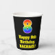 This exciting and colourful birthday paper cup design features a large number “8” having a rainbow spectrum gradient inspired pattern. It also features the message “Happy 8th Birthday,”, and a customizable name. The background is coloured black. Colourful, vibrant paper cups like this might be fun to have at a birthday celebration being held to celebrate somebody’s 8th birthday. [~Z0000537]
