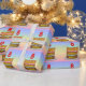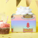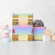 This upbeat and joyful birthday wrapping paper design features a cartoon-style depiction of a three-tier birthday cake having a number-shaped candle on top showing the age “8“, along with the message “HAPPY 8TH BIRTHDAY,”, and a personalized recipient name. The background has a multi-colour pastel rainbow spectrum inspired gradient pattern. Birthday themed wrapping paper like this might be a fun way to wrap a gift or present being given to celebrate somebody’s 8th birthday. [~Z0000622]