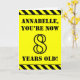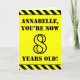 The front of this bold and attention-grabbing birthday themed greeting card design features a customizable name and the message "YOU’RE NOW 8 YEARS OLD!" in black stencil look text on a yellow coloured background. The front also features an eye-catching yellow and black striped pattern at the top and bottom edges. The inside features a customized birthday greeting message, or could perhaps be cleared and left blank if a message is to be written by hand instead. A personalized birthday card like this might be a fun way to acknowledge somebody’s eighth birthday. [~Z0000413]