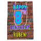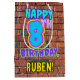 The front of this fun birthday-themed gift bag design features the message “HAPPY 8TH BIRTHDAY,” having a vibrant, colourful, urban street art and graffiti inspired appearance, in addition to a customizable recipient name. The background features a brick wall inspired pattern. A birthday themed giftbag like this might be a fun way to wrap a gift or present being given to celebrate somebody’s eighth birthday. [~Z0000536]