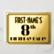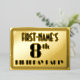 The front of this luxurious and 1920s-1930s era style inspired eighth birthday party foil invitation card design features a custom name, an art deco look inspired number “8th”, the message “BIRTHDAY PARTY”, and a border pattern consisting of lines. The back features personalized details about the event, such as the date, time, location/venue, and any other information that may be relevant. Stylish, elegant, personalized invitations like these might be used to invite attendees to a birthday party/gathering being held in celebration of somebody’s 8th birthday. [~Z0000606]