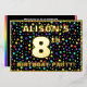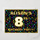 The front of this vibrant eighth birthday party/celebration foil invitation card design features a personalized name, a large number “8th”, the message “BIRTHDAY PARTY!”, and a border. The background of the front features an exciting, colourful pattern of star shapes. The back features personalized details about the event, such as the date, time, place, and any other relevant information. Customized invitations like these might be a fun way to invite attendees to a birthday party/gathering being held in celebration of somebody’s 8th birthday. [~Z0000600]