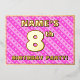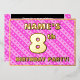 The front of this upbeat and loving eighth birthday party/celebration foil invitation card design features an editable name, a large number “8th”, the message “BIRTHDAY PARTY!”, and a border. The background of the front has a joyful dark pink and light pink stripes pattern, with heart shapes. The back features personalized details about the event, such as the date, time, venue/location, and any other information that may be useful. Personalized invitations like these might be a fun way to invite attendees/guests to a birthday gathering/party being held to honour somebody’s 8th birthday. [~Z0000603]