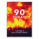 A funny birthday cake for someone who is turning 90. A forest fire burning behind some buildings, and the slogan "I see they lit your birthday candles!"