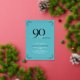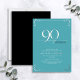 This beautiful invitation features hand lettered calligraphy artfully presenting 'ninety' in luxurious hand lettering against a turquoise background, adorned with delicate swirls in the corners top and bottom in real silver foil, along with the name and the number 90. This image will have all your guests excitedly anticipating your fabulous ninetieth festivities!