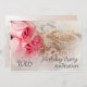 Une belle image délicate d'un rose dans les tons roses doux. dans l'arrière - plan est une chaîne de perles. L'ensemble est adouci par une plume délicate. Une délicieuse invitation à la fête d'anniversaire. Remplacer par les détails de votre propre fête