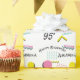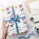This custom wrapping paper features a retro 1990s kid theme with a colourful memphis pattern. The memphis pattern consists of bright, pink, yellow, and teal geometric shapes that was popular in the 90s. The phrase "Happy birthday" is printed above a sample name in black. A sample birth year is printed in a large black fot to the bottom left of the design. You can personalize the wrapping paper to include your own name or custom text.