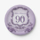 Design in the style of coat of arms in purple colors with large 90th + "BIRTHDAY CELEBRATION" onto a ribbon. Design on party paper plate with name. You can easily change name (color, font, size and position) by clicking the customize button. Available with design for 60th, 70th, 80th, 95th birthday. Matching party paper napkin, birthday invitation, birthday Save the Date, birthday guest book (spiral notebook), favor box, gift tag, pillow, mug and other birthday gifts for grandmothers.