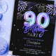 Celebrate a milestone birthday in style with our personalized 90th birthday invitation featuring blue iridescent foil balloon numbers! This elegant design showcases a black background adorned with a stunning overlay of blue, purple, silver fireworks and stars, making it the perfect choice for a festive and stylish celebration. The foil balloon numbers add a touch of luxury, while the script font adds a personalized and unique touch. This invitation is perfect for a 90th birthday party for him or her. Make his special day even more memorable with this colourful and sophisticated invitation!