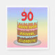 This upbeat and cheerful birthday paper napkin design features a cartoon-style depiction of a three-tier birthday cake having numeral-shaped candles on top showing the number “90“, along with the message “HAPPY 90TH BIRTHDAY,”, and a customizable recipient name. The background features a multi-colour pastel rainbow spectrum inspired gradient pattern. Fun birthday themed paper napkins like these might be used at a birthday party in celebration of somebody’s 90th birthday. [~Z0000623]