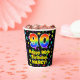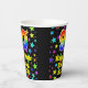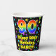 This colourful and joyful birthday paper cup design features a large number “90” with a rainbow spectrum gradient inspired pattern, along with the message “Happy 90th Birthday,”, and a custom name. The background features a vibrant and colourful pattern featuring many star shapes with different colours and sizes. Vibrant, colourful paper cups like this might be fun to use at a birthday celebration being held in celebration of somebody’s ninetieth birthday. [~Z0000540]