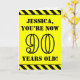 The front of this fun and bold birthday-themed greeting card design features a personalized name and the message "YOU’RE NOW 90 YEARS OLD!" in black stencil look text on a yellow colored background. The front also features an eye-catching yellow and black striped pattern at the top and bottom edges. The inside features a customizable birthday greeting message, or could perhaps be cleared and left blank if a message is to be written by hand instead. A customizable birthday card like this might be a fun way to send birthday wishes to somebody who is celebrating their ninetieth birthday. [~Z0000413]
