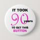 This milestone 90th birthday gag gifts button for her reads, "It took 90 years to get this button". With hot pink and black text this design was clearly made just for women. It makes a wonderful gag gift for the woman celebrating a ninetieth birthday. Words and Design protected by Copyright Kathy Henis 9-25-13